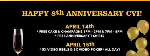 The celebration starts Friday with cash and freeplay for you in more of our April Anniversary Drawings at 5, 7 and 9 PM when you can win up to $15,000! On Saturday, Inn Club members Earn Five Times Points on all slot/video play and everyone is invited for Free Cake and Champagne in the casino from 1 to 2 PM and again from 7 to 8 PM. We’ll also be handing out Free 8th Anniversary T-Shirts at random times throughout the day on Saturday. We wrap it up all day Sunday when INN Club members earn 3X Points on Video Poker and 5X Points on our many remaining video slots.