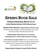The Friends of the Douglas County Library will host a two-day used book sale, Friday and Saturday, March 13-14, at the Minden Library, 1625 Library Lane. A preview sale for Friends of the Library will be held from noon to 2 pm on Friday, March 13; non-members are welcome to join at the door. Members of the Friends receive a 10% discount on all purchases throughout the sale. The sale will open to the public starting at 2 pm on Friday, March 13, and continues Saturday, March 14 from 10 am to 4 pm, with a ½ price sale from 3 to 4 pm. on Saturday. The sale will feature hardback and paperback fiction and nonfiction, vintage, teen, and children’s books, puzzles, and more. Donations of 1 or 2 bags or small boxes of books are accepted at the library during regular hours. For larger donations, contact the library at 775-782-9841.