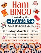 The Kiwanis Club of Carson Valley is hosting its annual kid friendly Ham Bingo on Saturday, March 28, 2026, in the Dining room of Douglas County Community & Senior Center located at 1329 Waterloo Ln, Gardnerville, Nv. There will be two bingo sessions; 12 noon, 3 pm. Doors open at 11:30am.